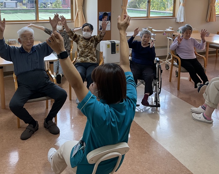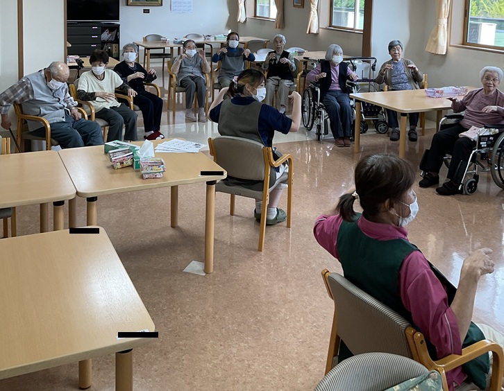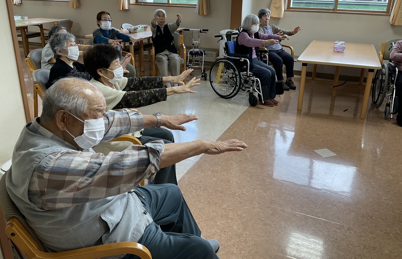 職員がお手本となってグーパーしたり、手足を伸ばしたりと全身運動を行ないました。