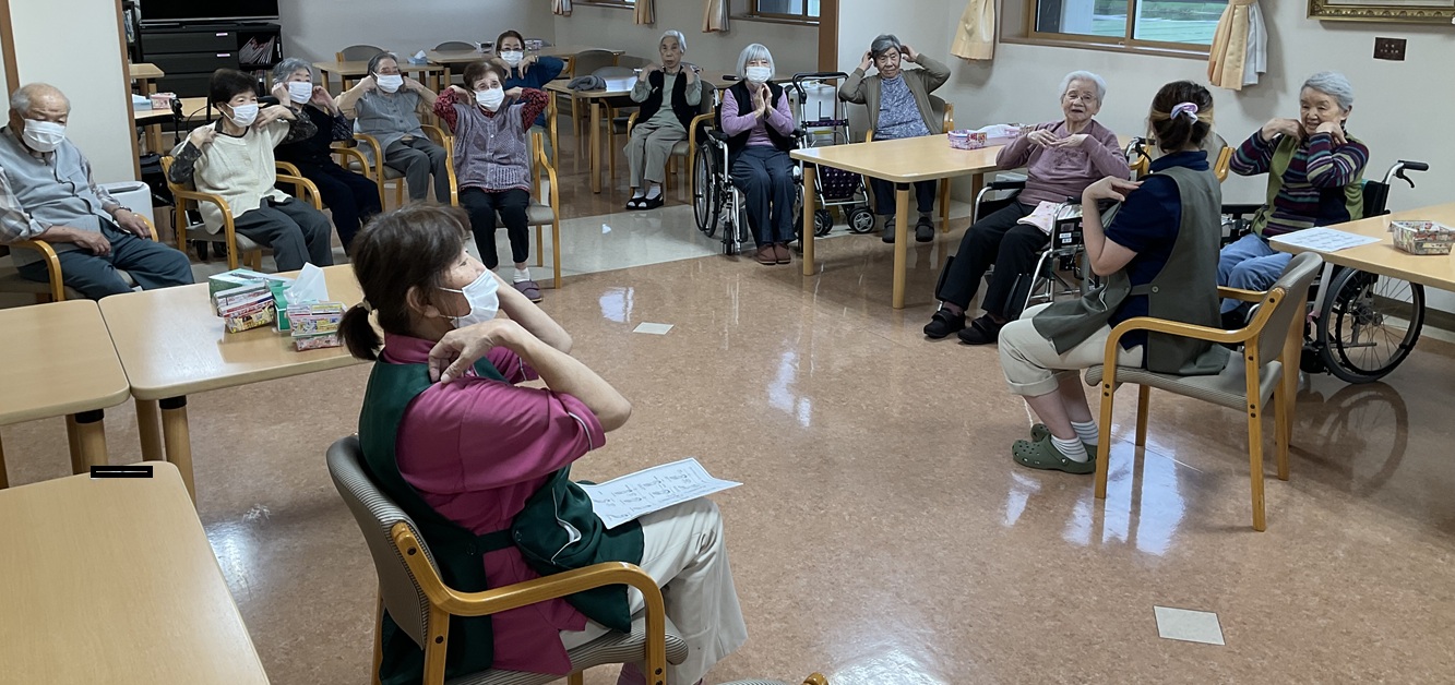 10月8日は体操を行ないました。皆さん一度は聞いた事のある「いい湯だな」「金太郎」「うさぎとかめ」の歌に合わせて身体を動かしました。