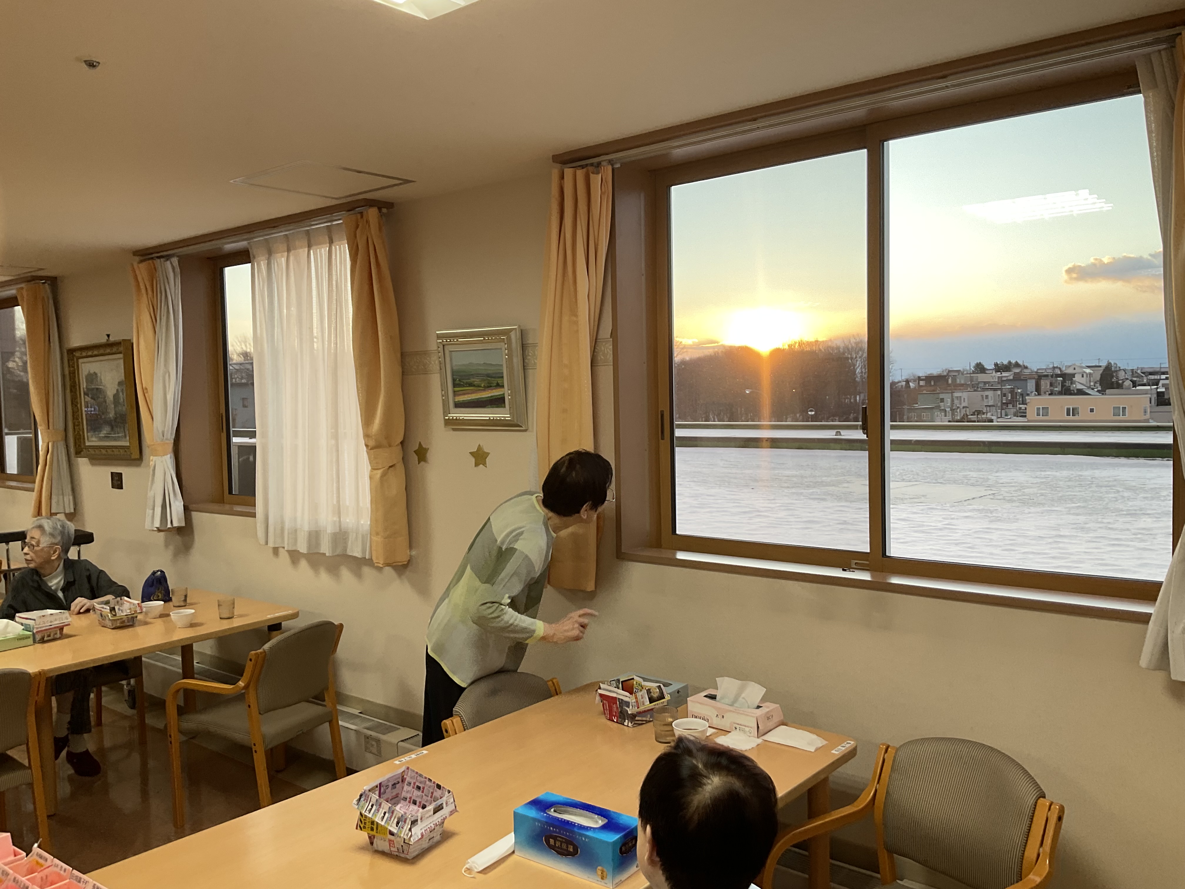 皆様と一緒に見ました‼  レストランから見る日の出は丁度、木々を