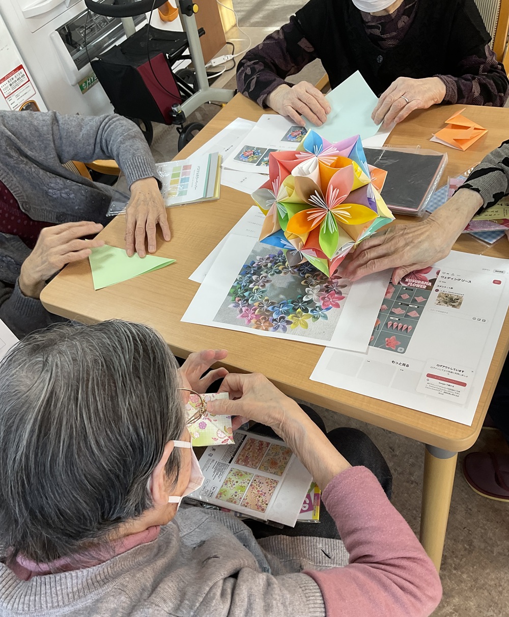 最近、入居者様から「リラク室にある折り紙のくす玉を作ってみたい‼」と希望があり、花びらの折り方は簡単なため数人で作っています✨